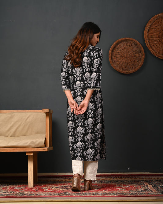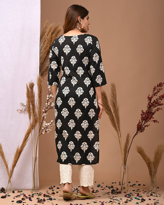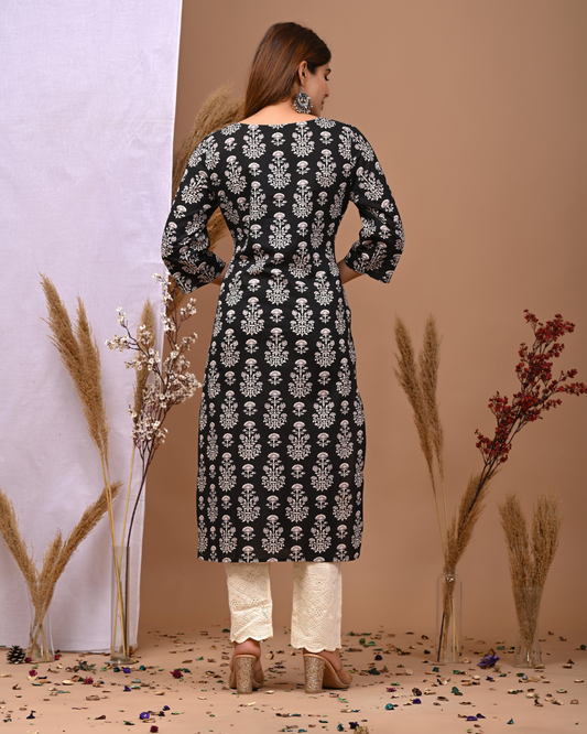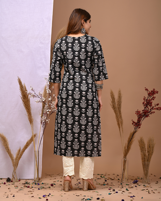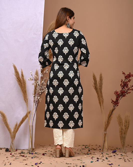 RimeLine Black Ethnic Motifs Printed Round-Neck Cotton Kurti