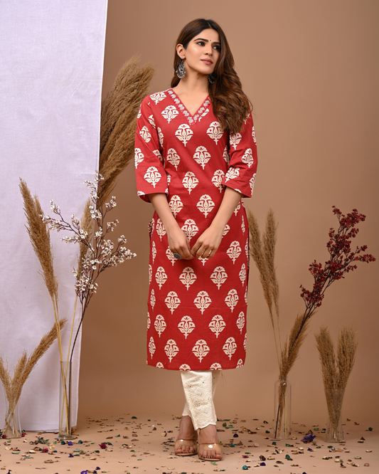 Floral Printed V-Neck Pure Cotton Straight Kurtas