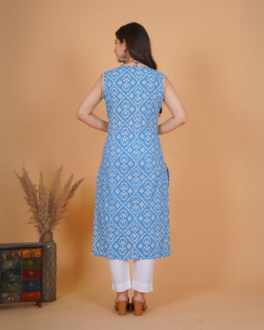 RimeLine Ethnic motifs printed Round neck Sleeveless Blue Straight Kurta for Women