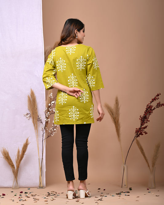 RimeLine Yellow Printed Collered Neck Kurti For Women