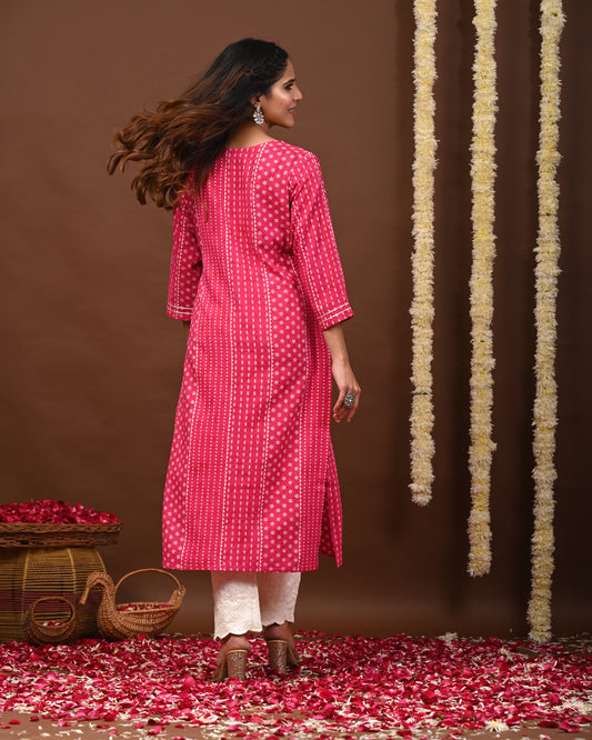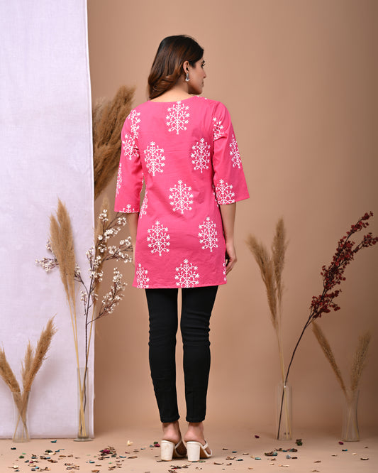 RimeLine Pink Ethnic Motifs Printed Round-Neck Cotton Kurti