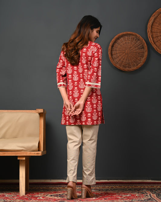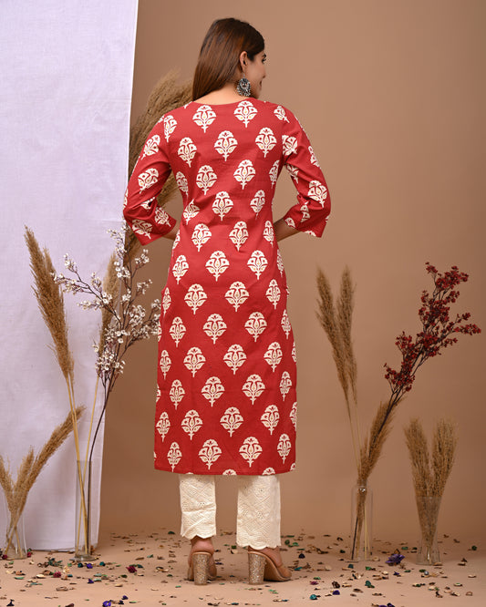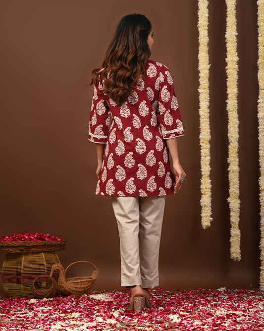 RimeLine Maroon Women Ethnic Motifs Printed Round-Neck Pure Cotton Kurti