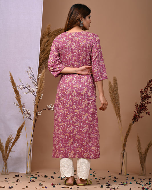 RimeLine Purple Ethnic Motifs Printed V-Neck Cotton Kurti