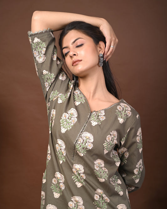 Rimeline Women Green Floral Printed V-Neck Cotton Short Kurti
