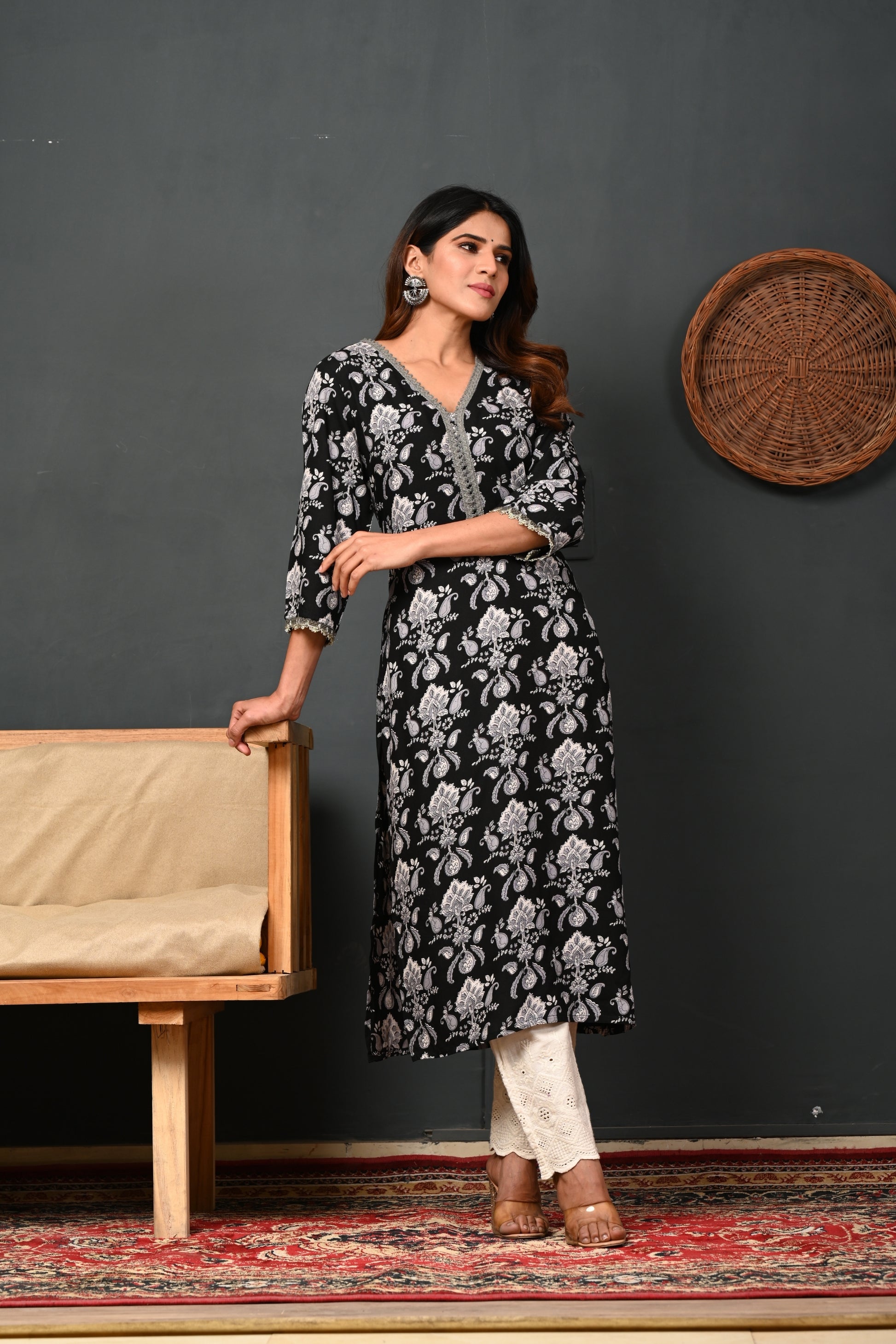 RimeLine Black Printed Rayon V-Neck Kurti for women