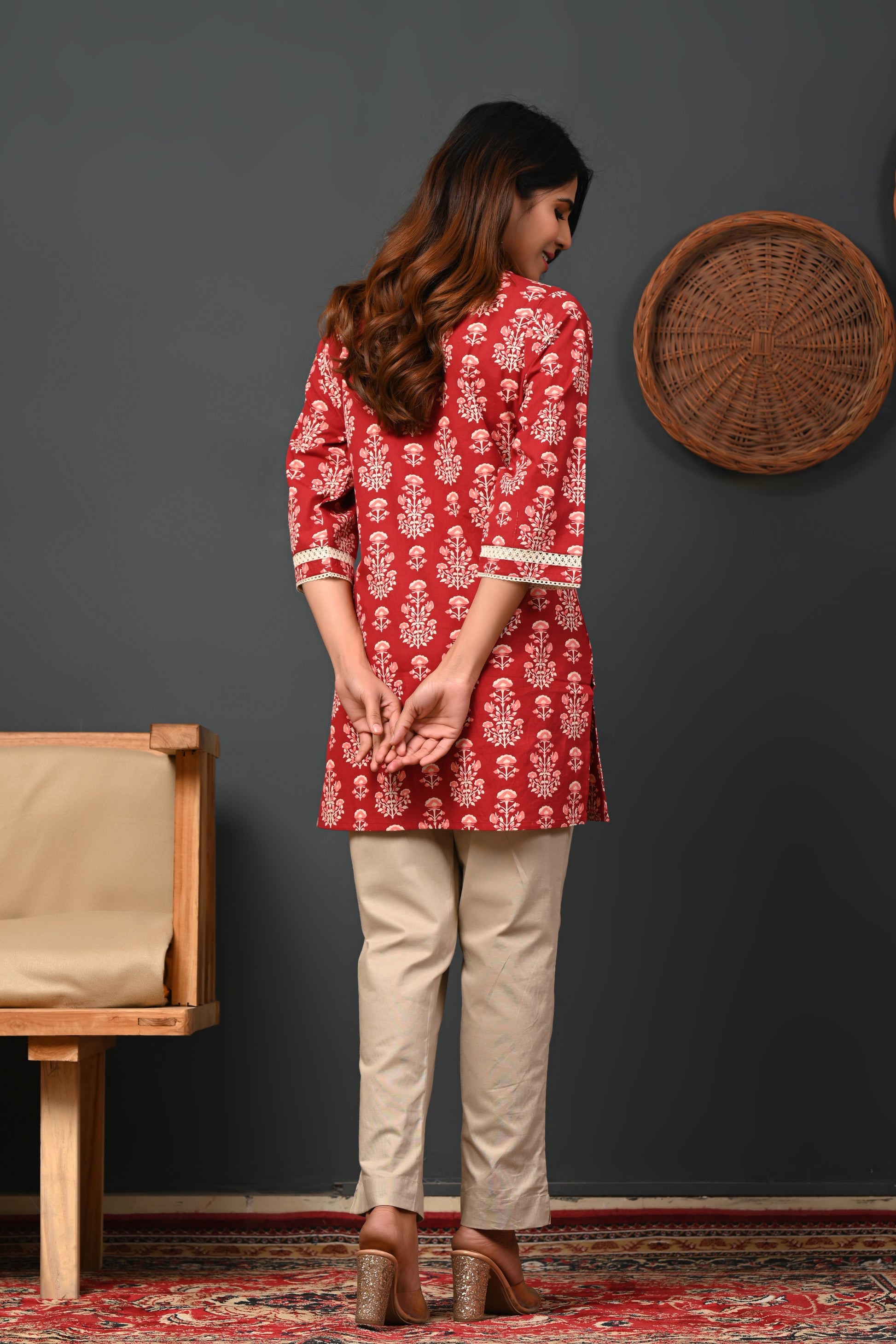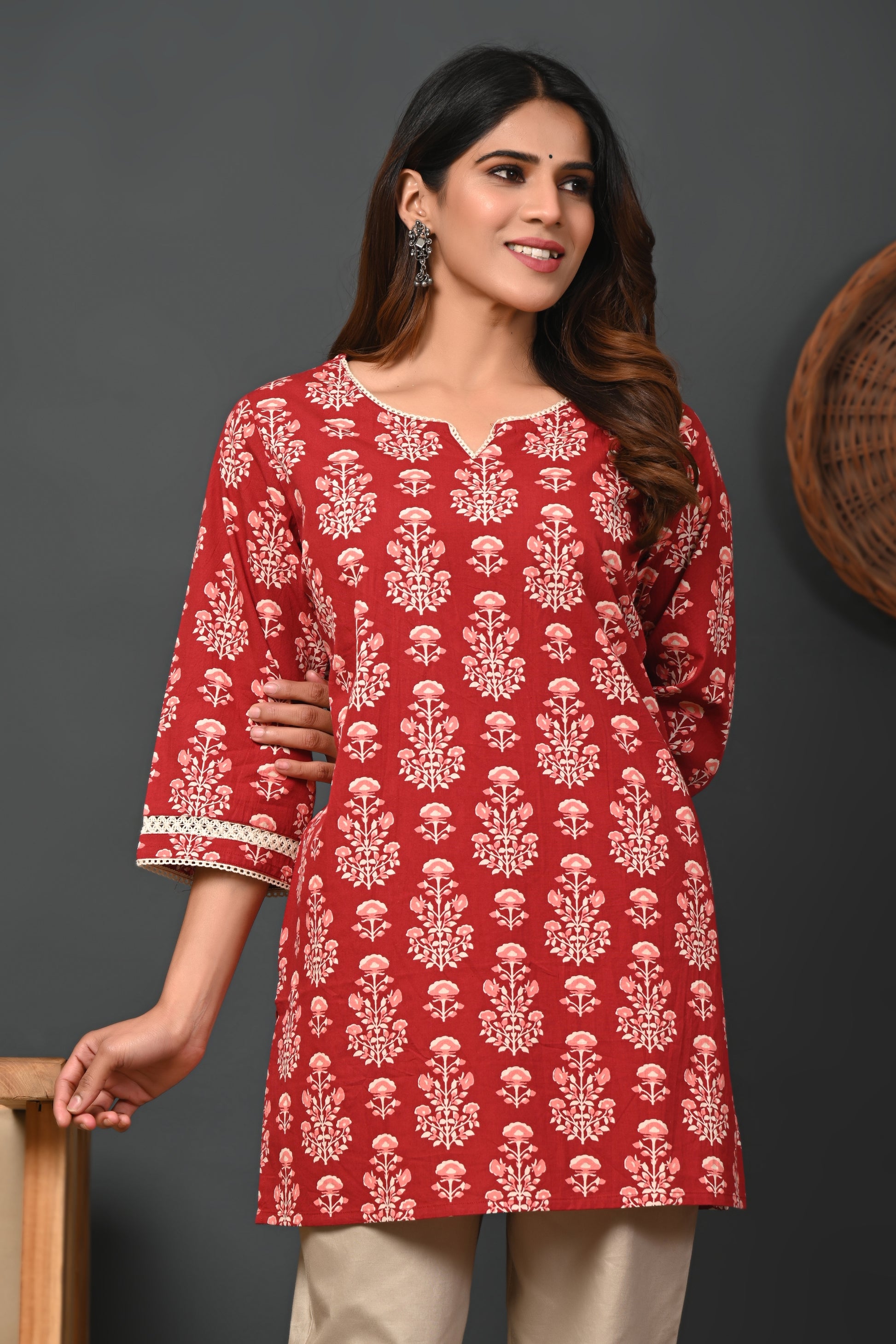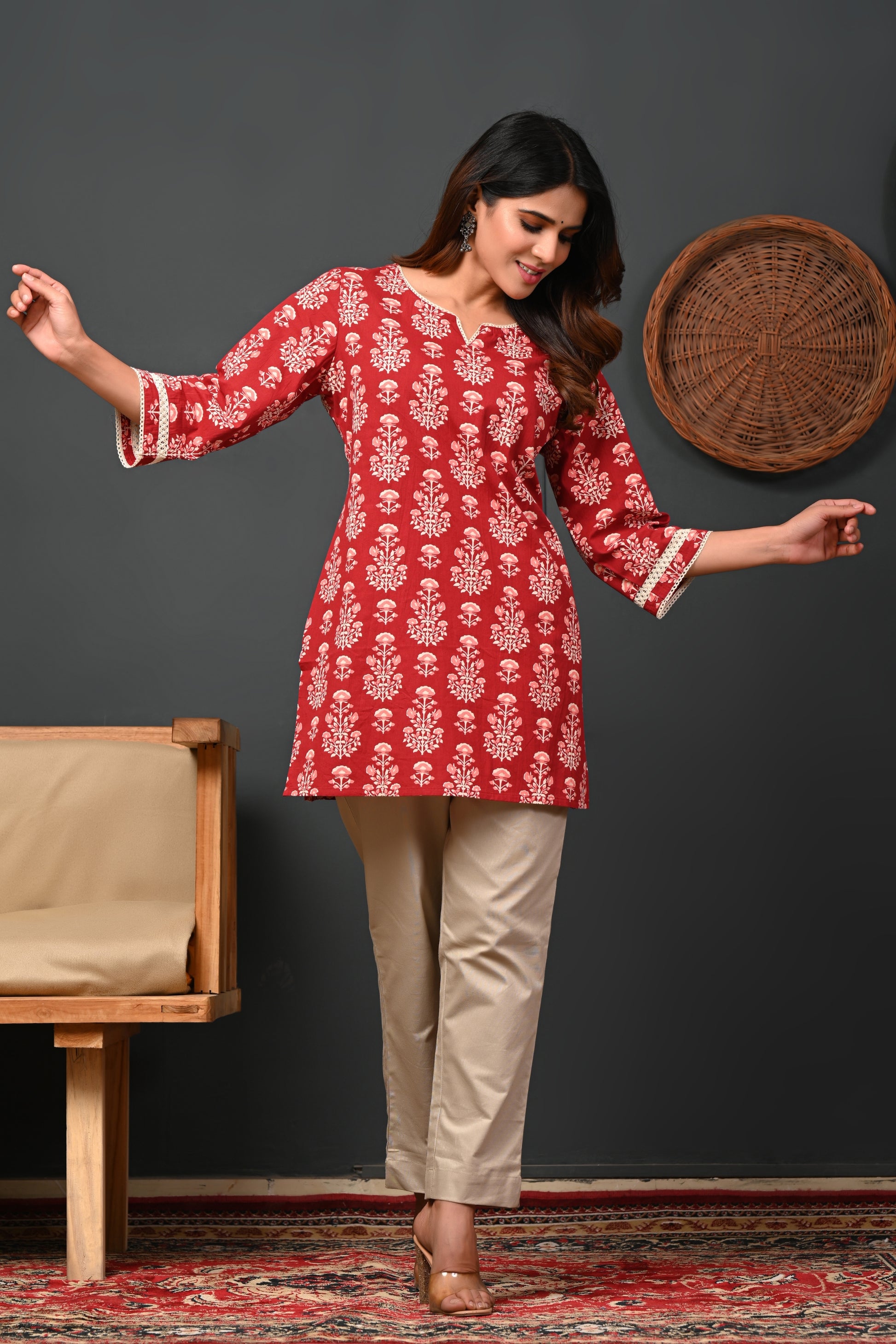 RimeLine Maroon Women Ethnic Motifs Printed Round-Neck Pure Cotton Kurti