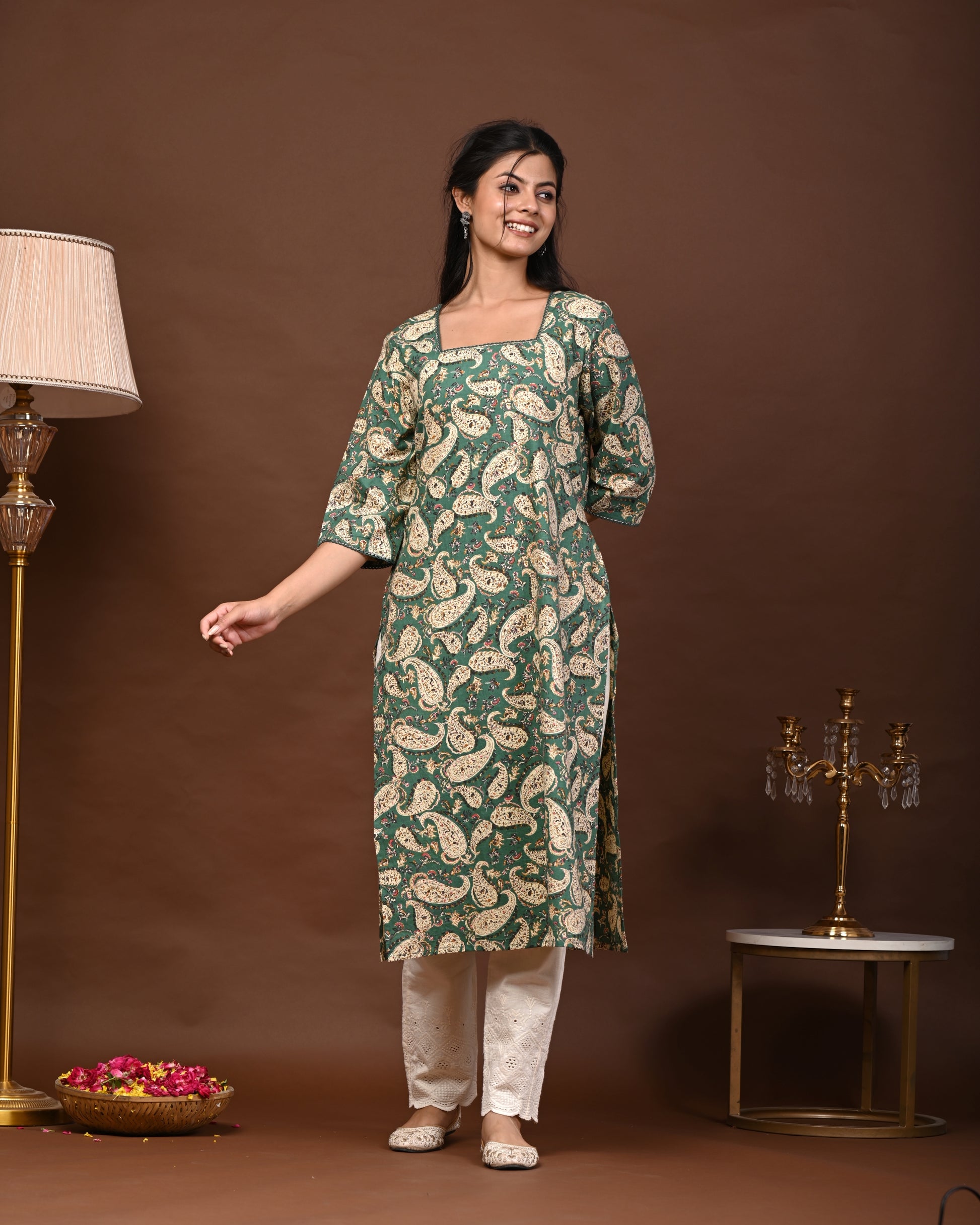 Rimeline Paisley Screen Printed Square Neck Pure Cotton Straight Kurta