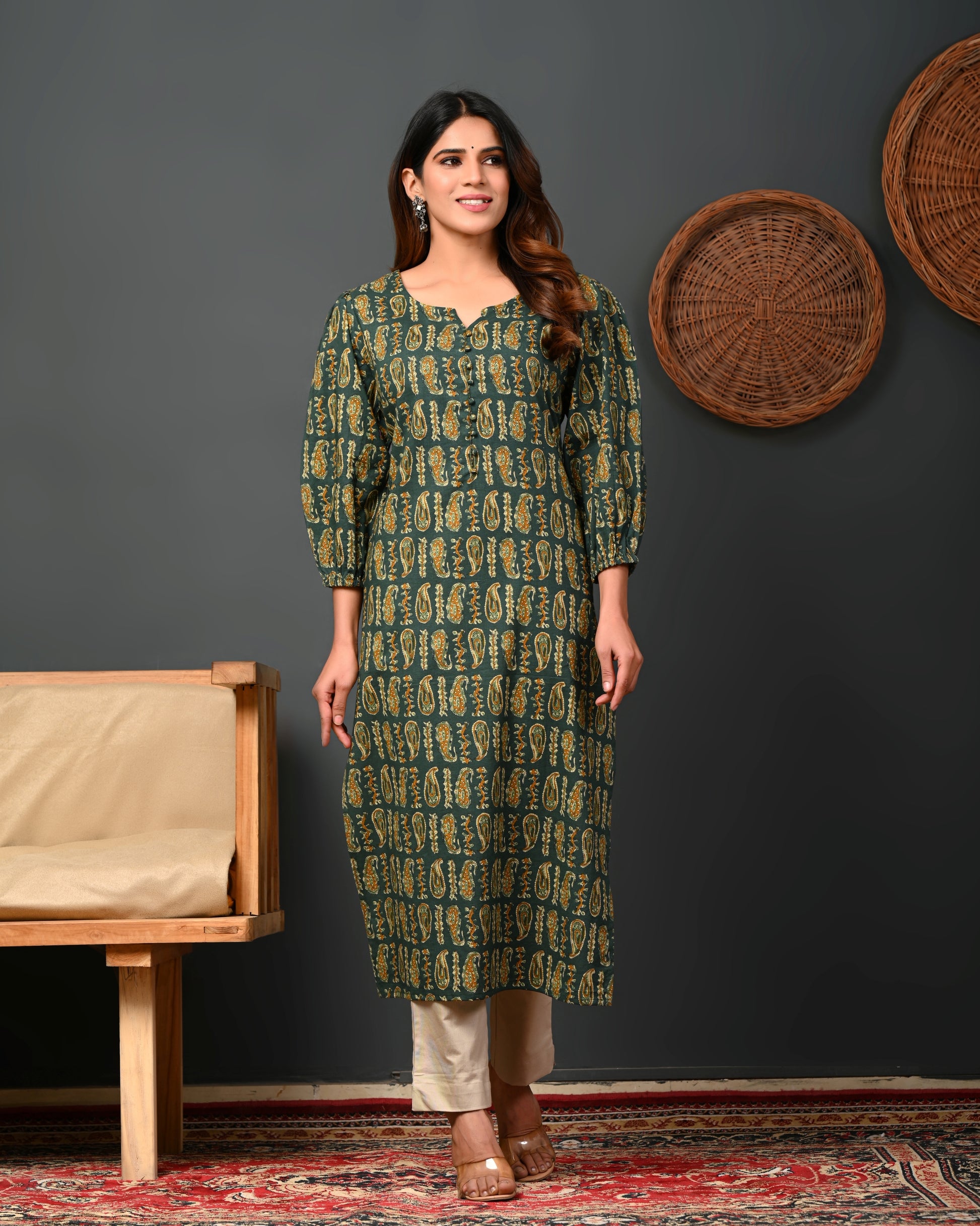 Rimeline Women Paisley Printed Puff Sleeves Pure Cotton Kurta