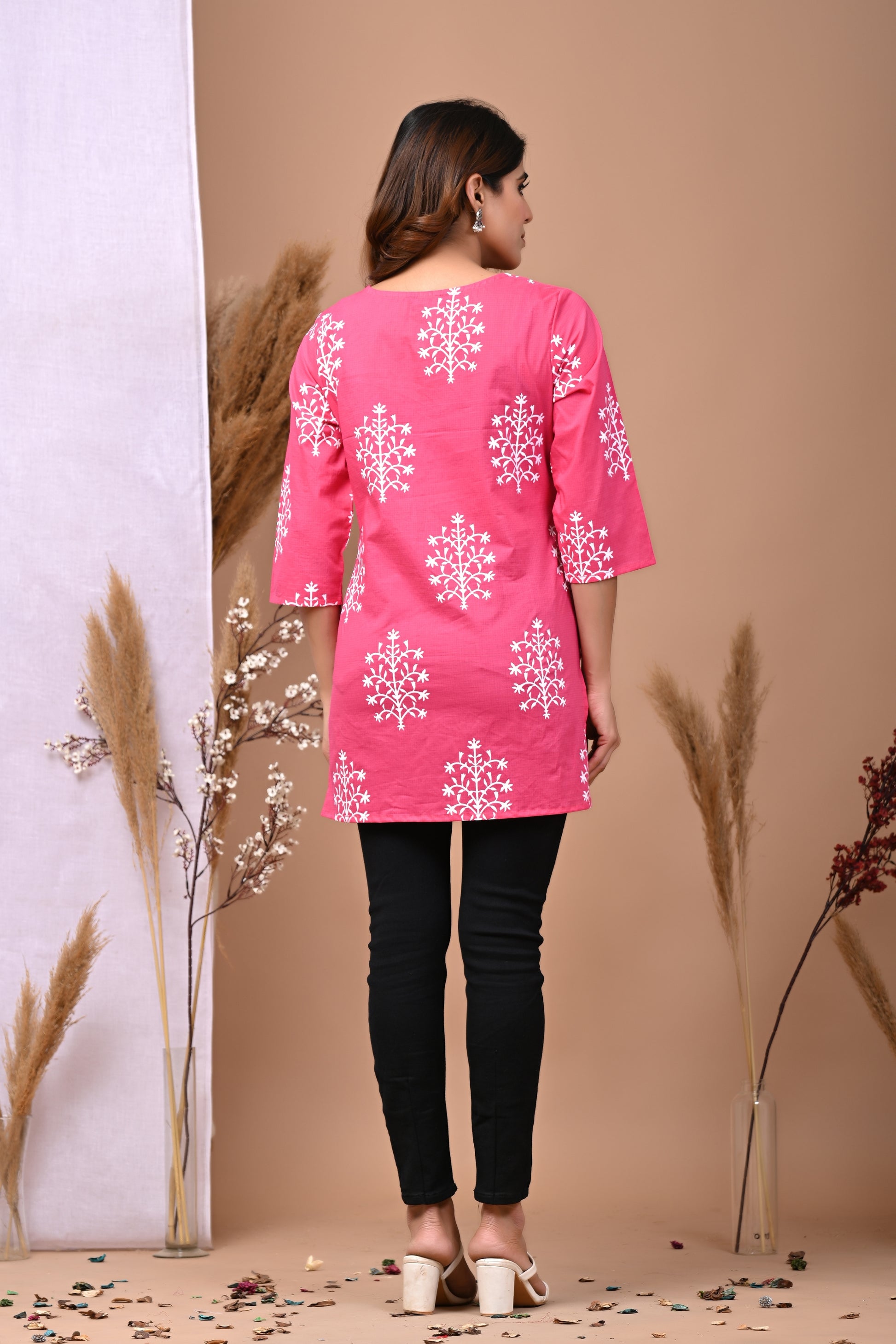 RimeLine Pink Ethnic Motifs Printed Round-Neck Cotton Kurti