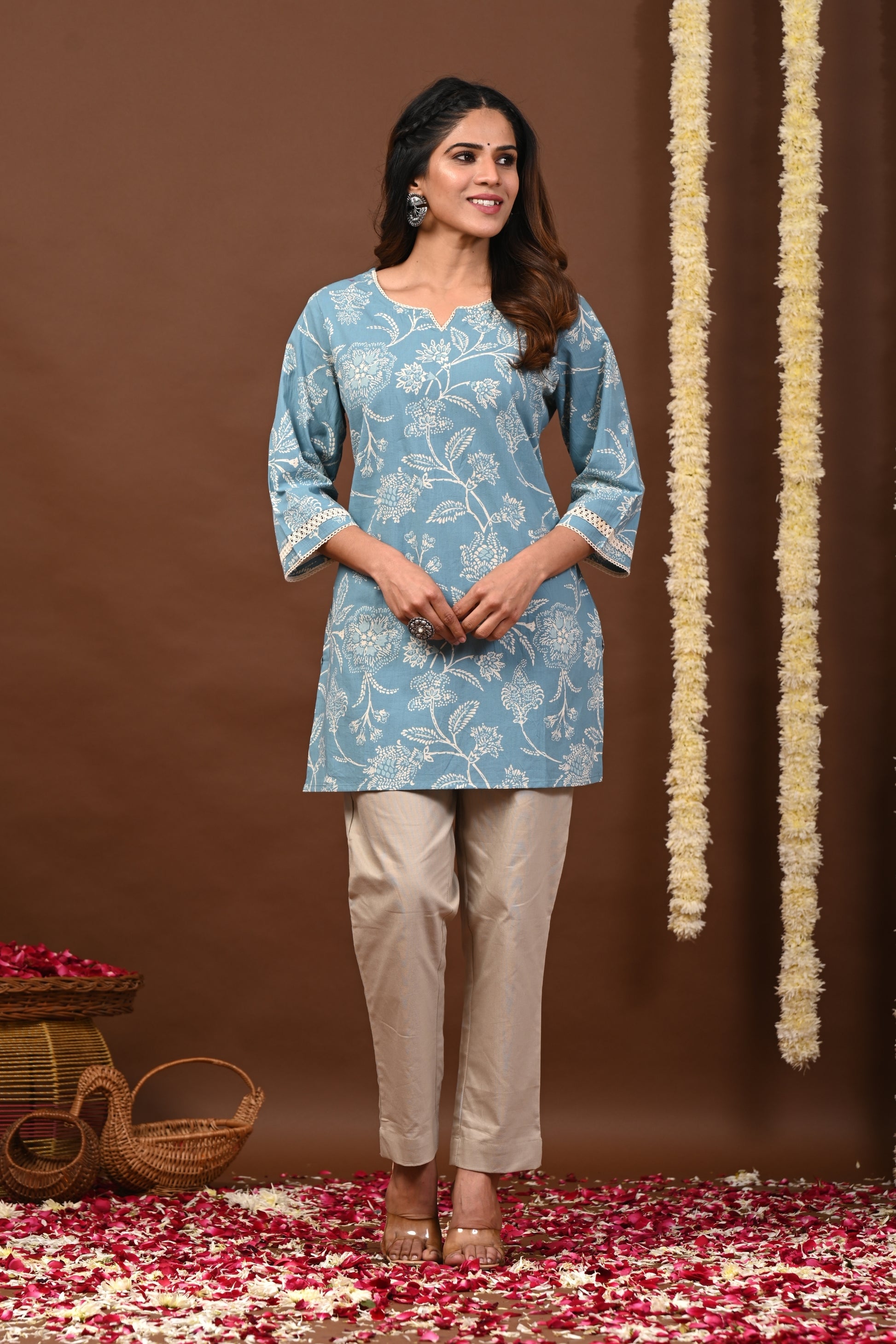 RimeLine Aqua Women Ethnic Motifs Printed Round-Neck Pure Cotton Kurti